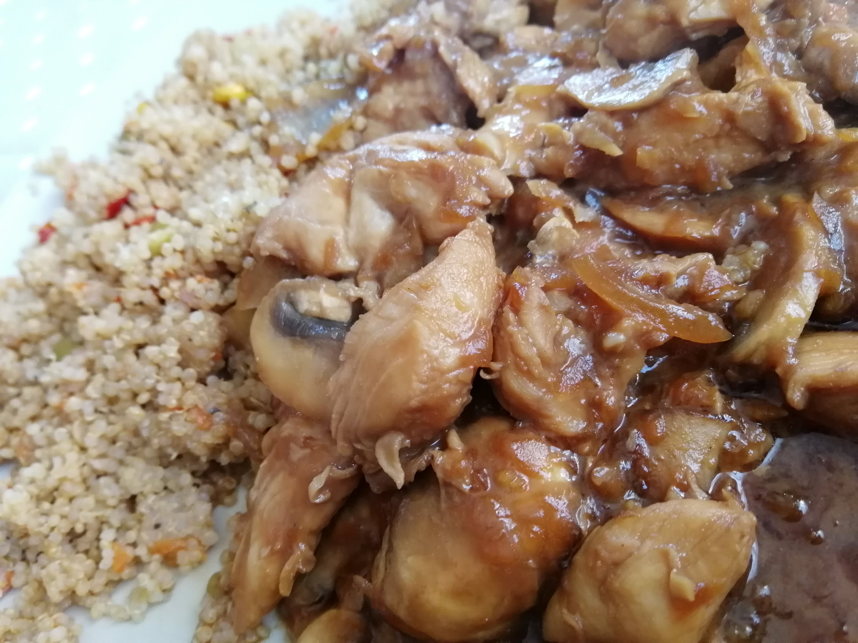 J’ai préparé un poulet mariné à la sauce yakitori et teriyaki avec des champignons et des oignons. Pour changer je l’ai accompagné avec du quinoa et c’était très bon ! Je trouve que c’est un peu sec à manger seul du coup la sauce de la marinade allait très bien avec le quinoa. Zhomme n’a pas spécialement aimé le goût lui par contre.