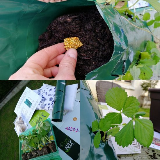 On reçoit dans sa box des plantations à repiquer chez soi, ce mois-ci j’ai reçu un sac de plantation pour faire un jardin suspendu composé de fraisier.