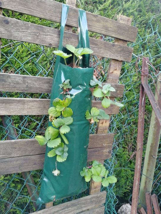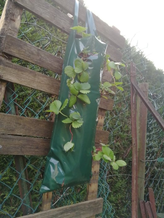 J’ai également déplacé un fraisiers de mon jardin car j’ai la chance d’avoir une jardinière tout le long de mon petit muret avec pleins de fraisiers et de fraises des bois que j’ai placé du coup sur le dessus du sac en supplément.