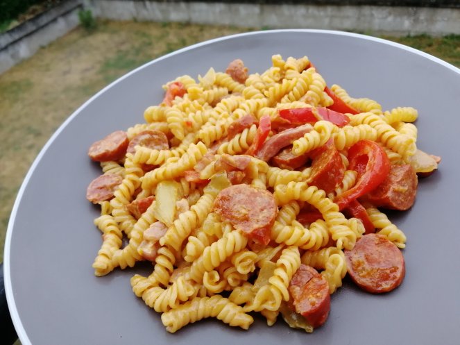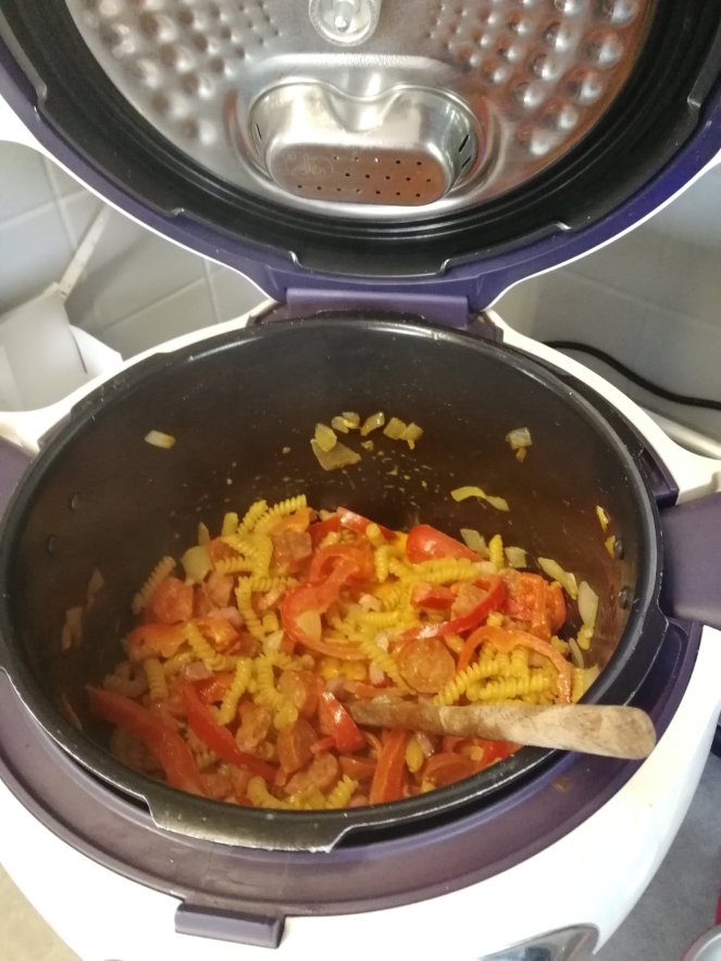 Ultra simple mais réussis et ce que j’aime c’est que je fais tout dans un seul récipient qui est la cuve du cookeo, je n’ai rien salis d’autre que ça, mon couteau et ma planche à découper ! Les pâtes ont le super bon goût du chorizo c’est vraiment un délice !