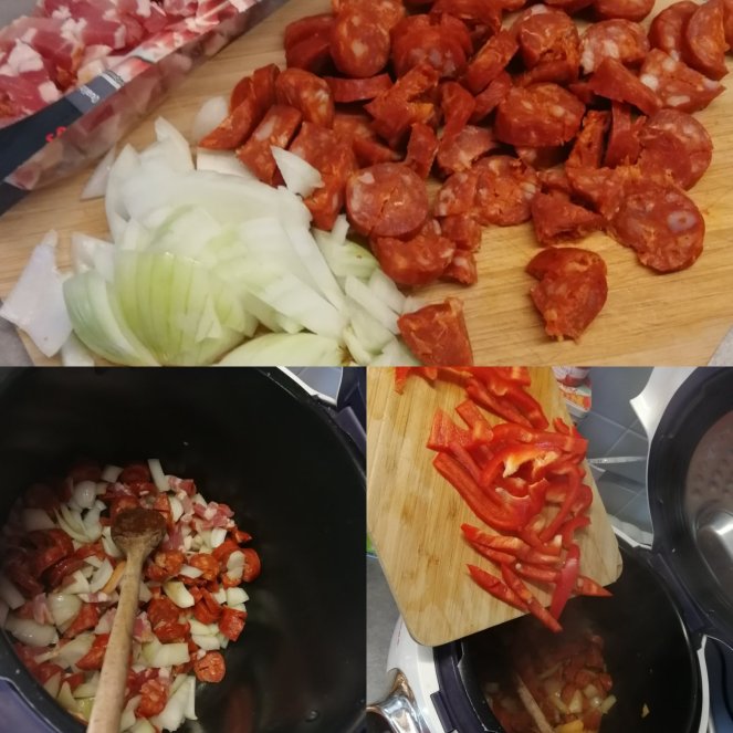 Mettez le programme en mode doré puis ajoutez les oignons, le chorizo et les lardons, ne rajoutez pas de matière grasse supplémentaire je pense qu’il y a ce qu’il faut hein…