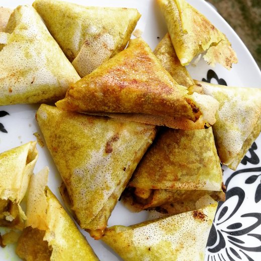 Tout simple pour la recette, il faudra juste vous initier au pliage des feuilles de brick pour faire de beaux triangles !
