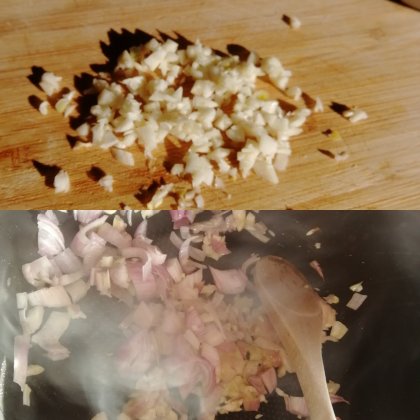 Coupez les oignons finement, l’ail et mettez à rissoler dans une cuillère d’huile d’olive.
