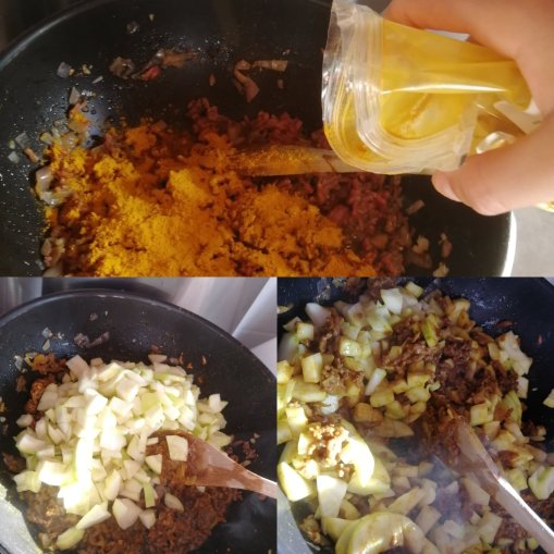 Ajoutez ensuite la viande hachée, mélangez, laissez cuire à feux doux en remuant puis ajoutez les 3 cuillères de sauce soja sucré puis le Curry et le gingembre. Mélangez bien.