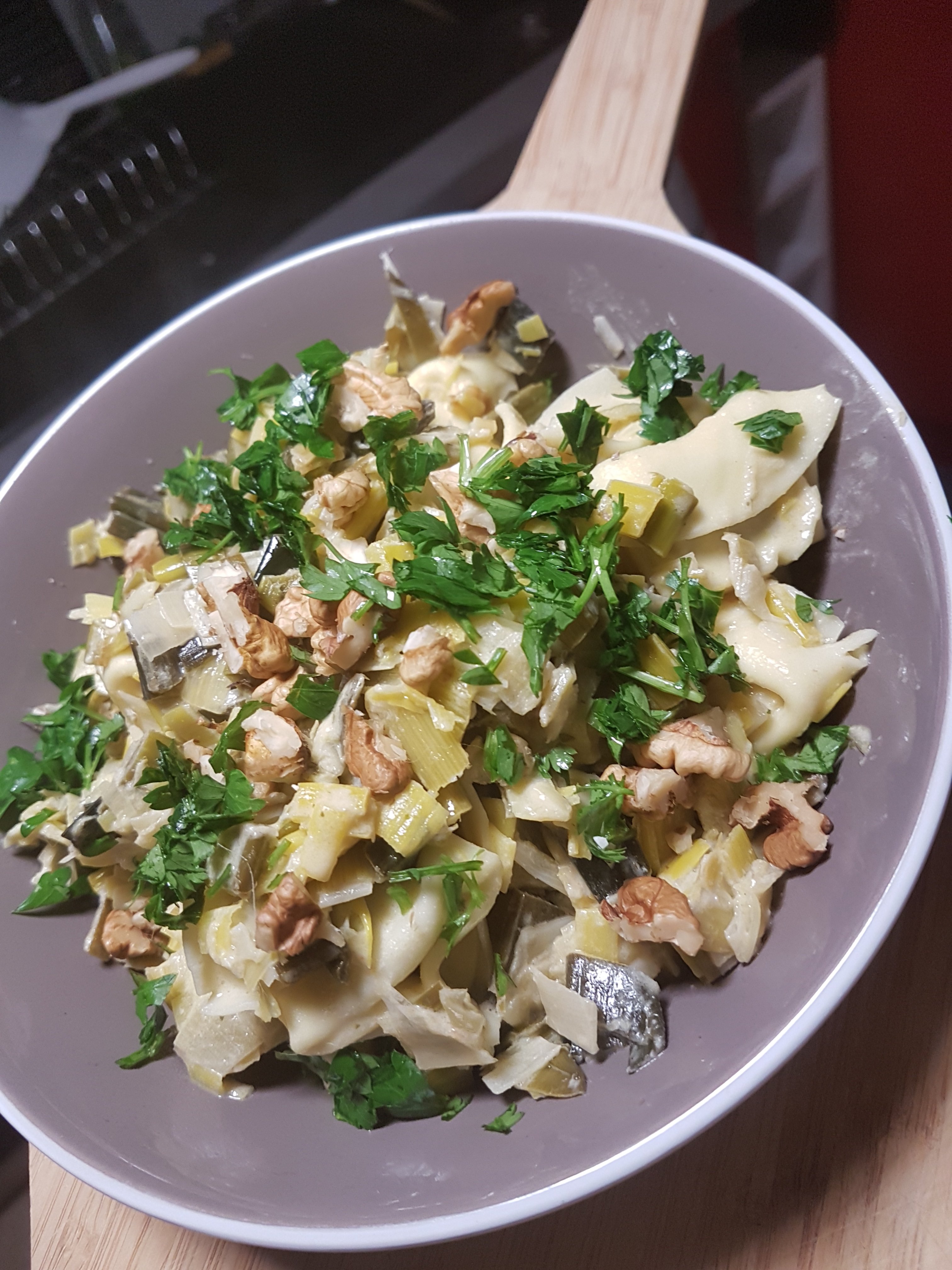 Une fois les poireaux cuits, on ajoute le chèvre, les noix, le persil et les pâtes cuites au préalable puis on mélange délicatement le tout avant de servir et de déguster !