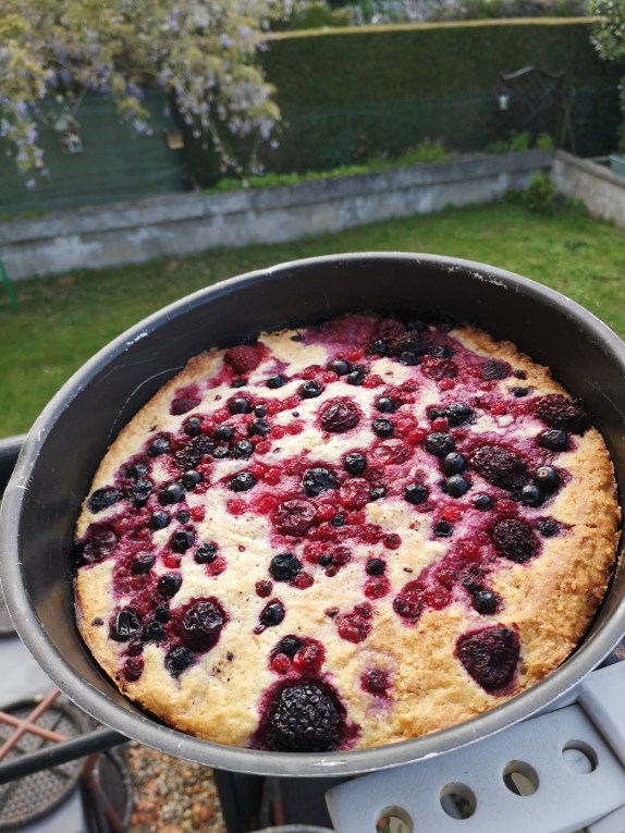 Beurrez votre moule puis mettez votre pâte, ajoutez sur le dessus vos fruits rouge, personnellement je prend un mélange surgelé.