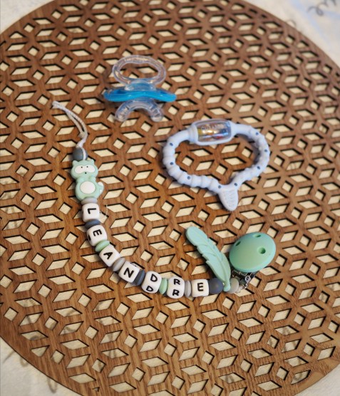 Des petites choses pour l’aider pour ses gencives ! Son hochet Curaprox, une tetine à mordre de chez Nûby, son attache avec un anneau de dentition (qu’il avait en bouche au moment de la photo ! ) et son petit singe orange qui manque sur la photo mais qui le suis partout !
