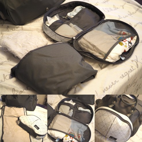 Je mets à l’intérieur deux changes pour Léandre comme ça quand il se salit la nounou peut le changer et mettre directement le linge dans la pochette afin d’éviter de salir le reste du contenu du sac !