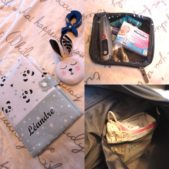 Et bien sur une petite trousse à pharmacie avec du doliprane, du serum physiologique, un thermomètre et des échantillons de produit au cas où nounou a besoin de lui faire prendre un bain !