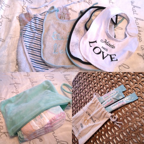 Avec à l’intérieur le minimum vital : couches, lingettes, coton, liniment, bavoir ou lange et body de rechange !