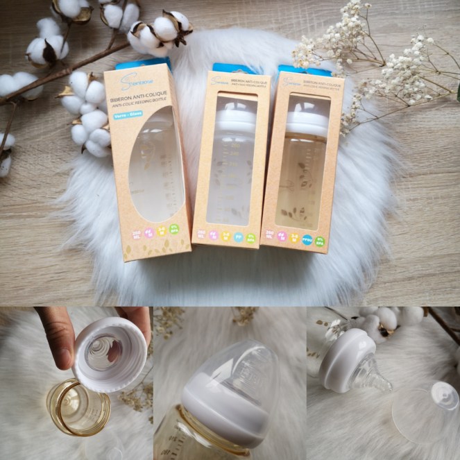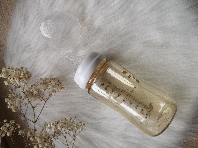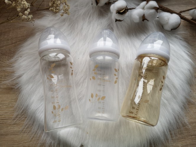 La marque propose des biberons en polyphénylsulfone (PPSU) qui sont d’une qualité supérieure aux biberons en plastiques que nous connaissons. Ils sont sont très résistant aux chocs. C’est le biberon en plastique plus foncé que vous pouvez voir sur la photo.