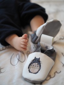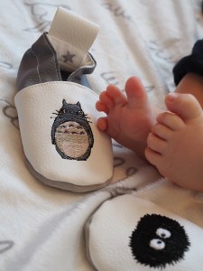 Elle a fabriqué pour Léandre d’adorables chaussons souples sur le thème de Totoro avec son prénom !