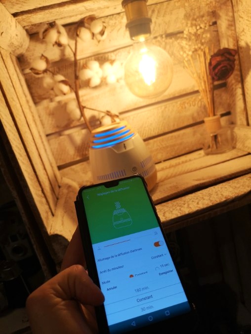 Avec la minuterie nous pouvons même programmer le diffuseur d’huiles essentielles à une heure précise pour qu’il puisse diffuser avant qu’on rentre à la maison !
