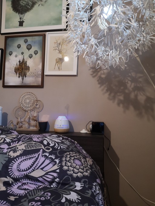On passe du salon à la chambre et si nous souhaitons continuer l’ambiance et la diffusion des huiles essentielles apaisantes, pas de soucis on l’emmène avec soi !