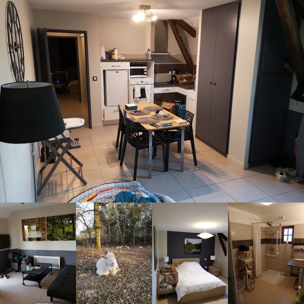 Un gîte à la ferme avec comme voisin des brebis et des chèvres ! Totalement dépaysant dans un bel endroit boisé avec les chèvres et moutons juste à côté de nous, le fermier qui habite juste derrière !