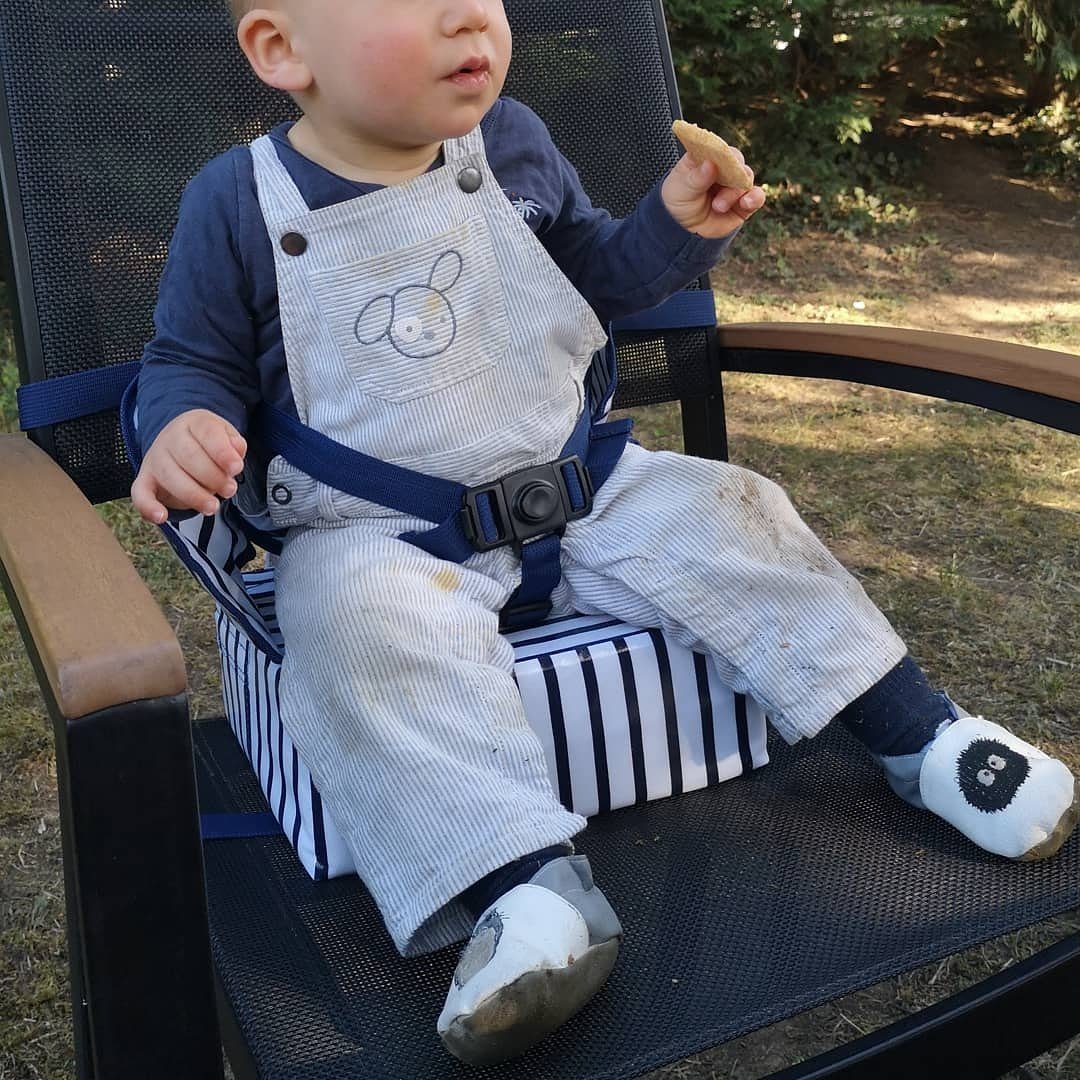 Alors nous c’est une photo vraie vie que je vous partage, bébé aux genoux sales car il a fait du quatre patte dans le jardin qui prend une petite pause goûter sur son rehausseur !