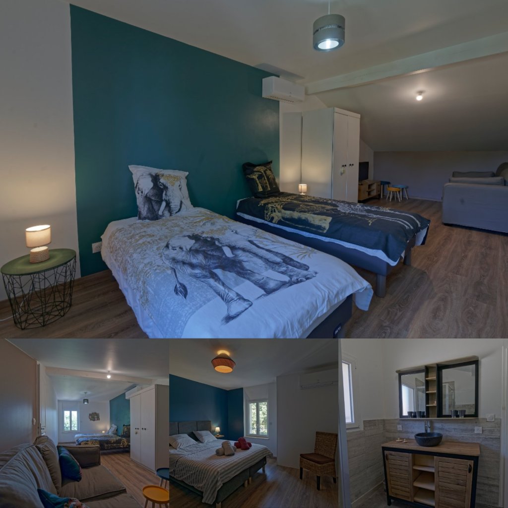 À l’étage vous y trouverez deux chambres une avec un lit double et une seconde avec deux lits simples pouvant se coller, un canapé et une salle de bain !